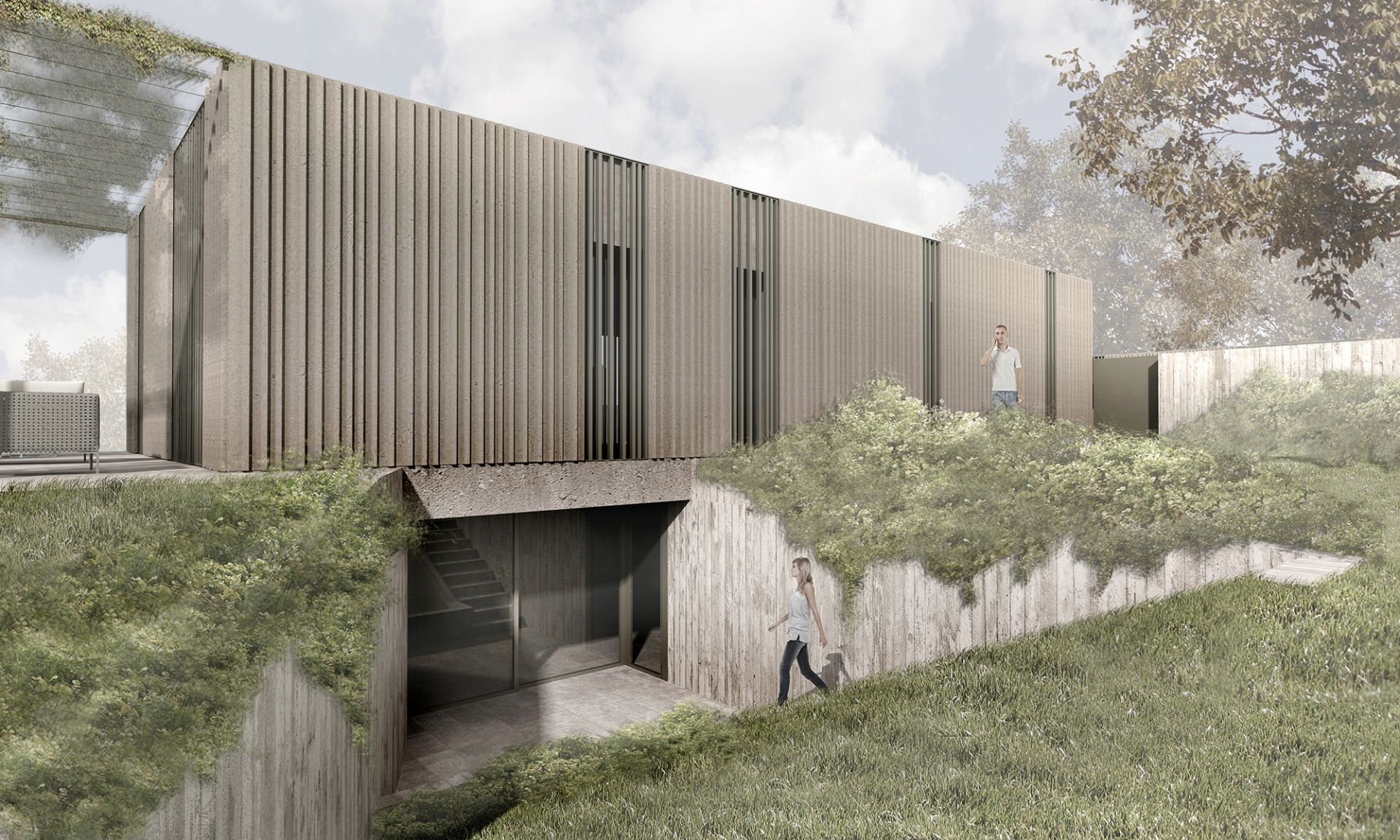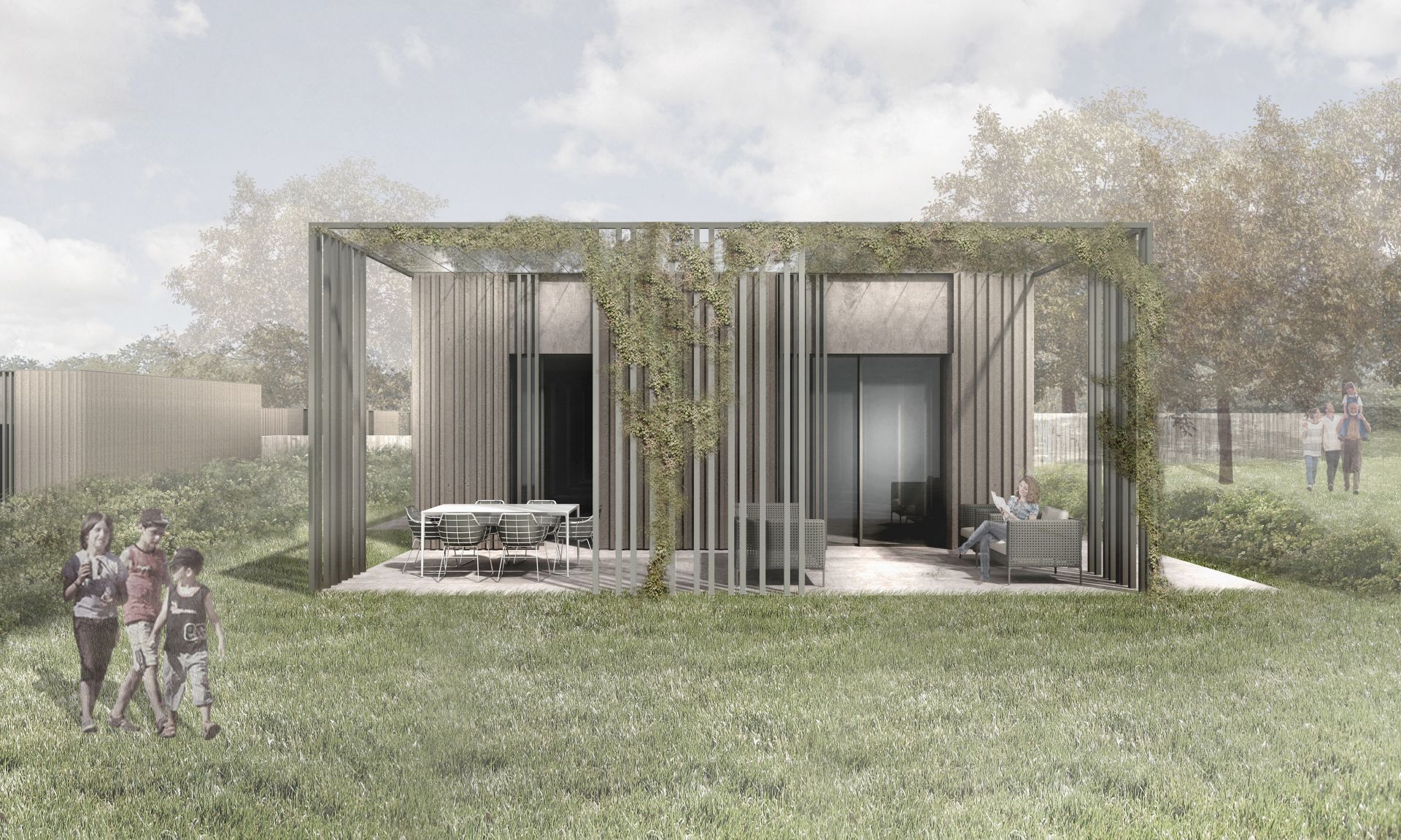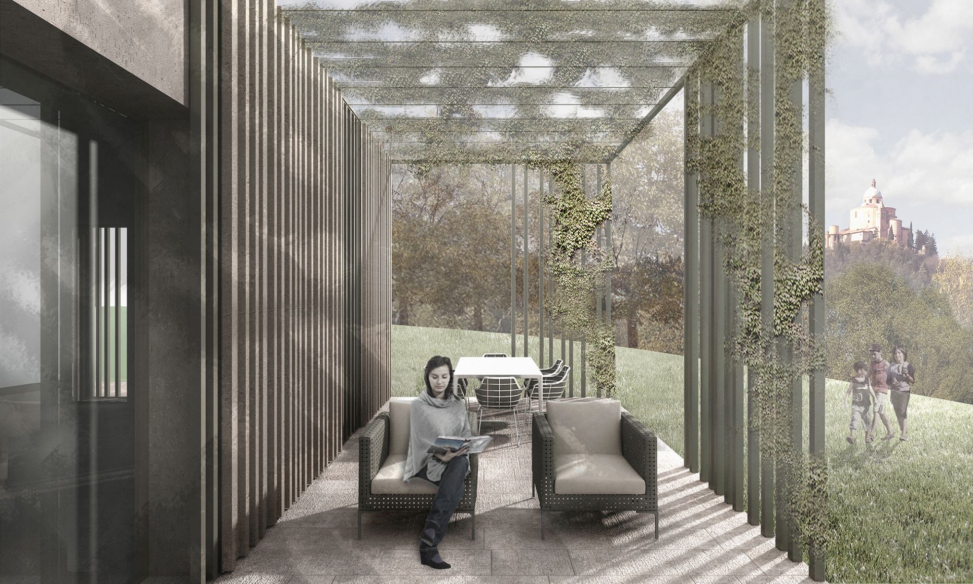 Esternamente, sulla testa dei singoli fabbricati, ogni unità presenta uno spazio pavimentato coperto da un pergolato, che diviene una cerniera tra esterno e interno dell'abitazione, proiettando la zona giorno verso l'esterno e il paesaggio verso l'interno. Particolare attenzione è stata posta all'orientamento dei fabbricati e alla collocazione e dimensione delle aperture, studiate appositamente per garantire le viste panoramiche migliori e, al contempo, la privacy degli interni.