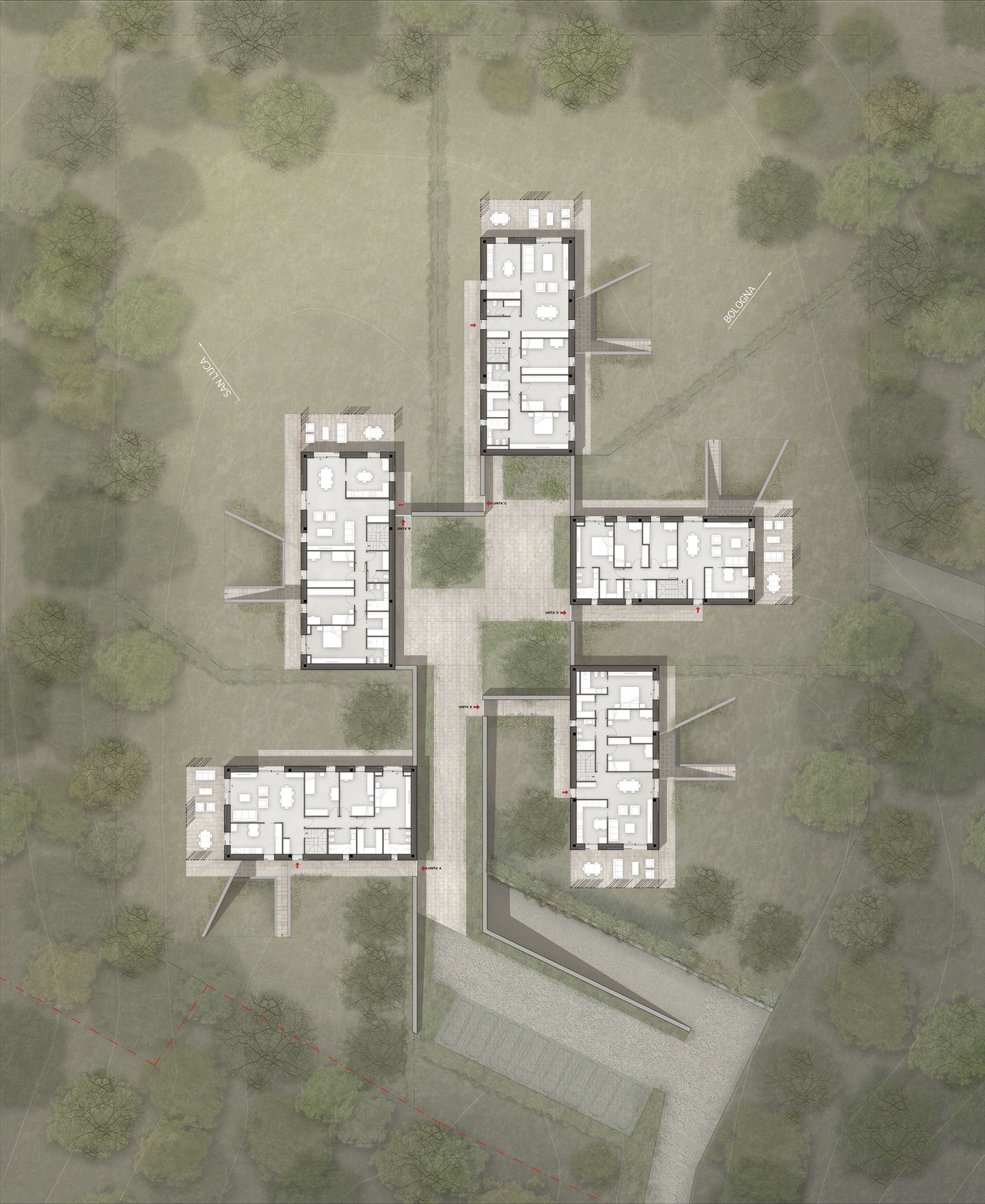L'intervento prevede la realizzazione di cinque unità abitative indipendenti, collegate da un sistema di distribuzione comune e da una "piazza" centrale pedonale, sulla quale si affacciano gli accessi alle diverse unità e che diventa il centro della vita della comunità, come in un borgo.