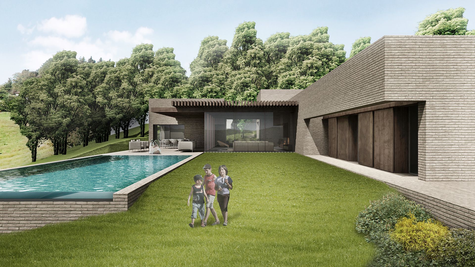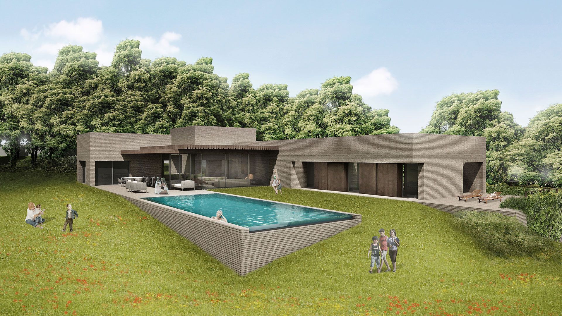 Nel paesaggio collinare alle spalle di Bologna, l'intervento prevede la demolizione di un edificio esistente e la successiva costruzione di una residenza destinata a un nucleo familiare composto da cinque persone. Il contesto paesaggistico rende prioritaria la relazione con la natura, indirizzando la scelta verso una casa con un solo piano fuori terra, per consentire da ogni ambiente l'accesso diretto all'esterno.