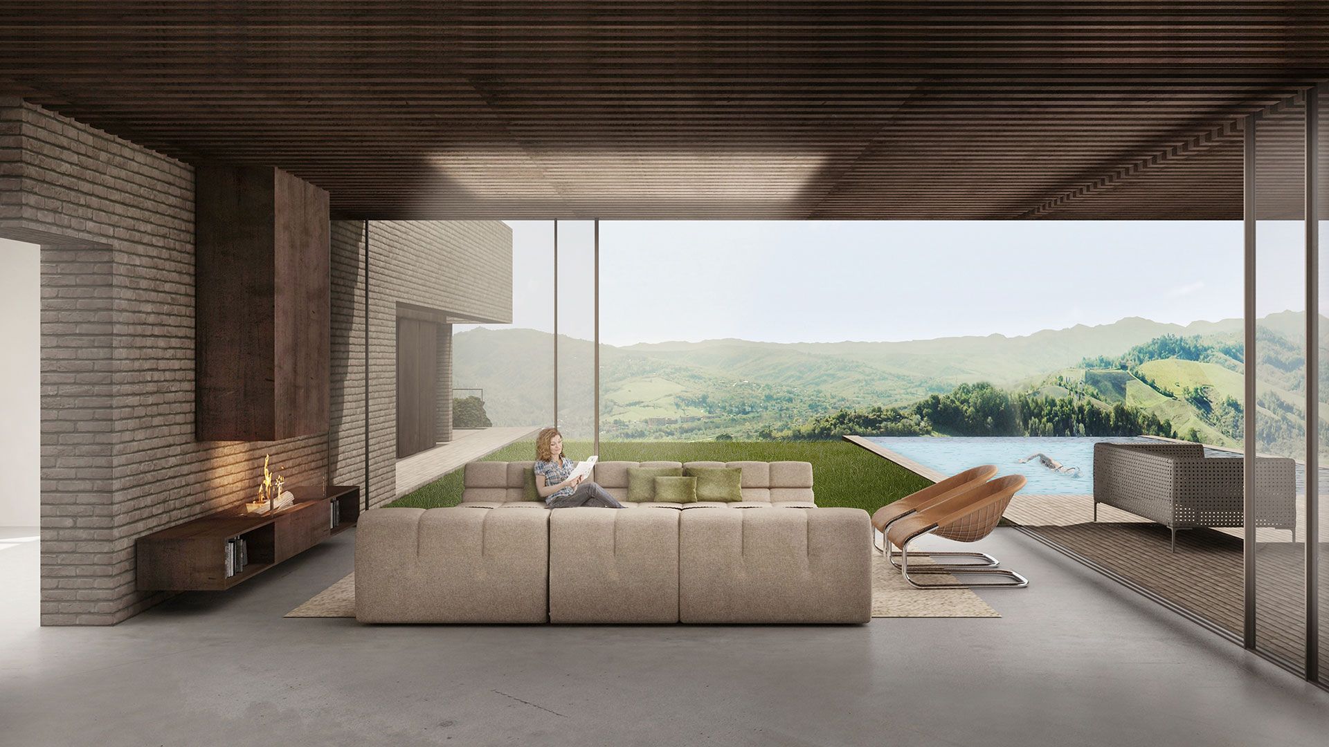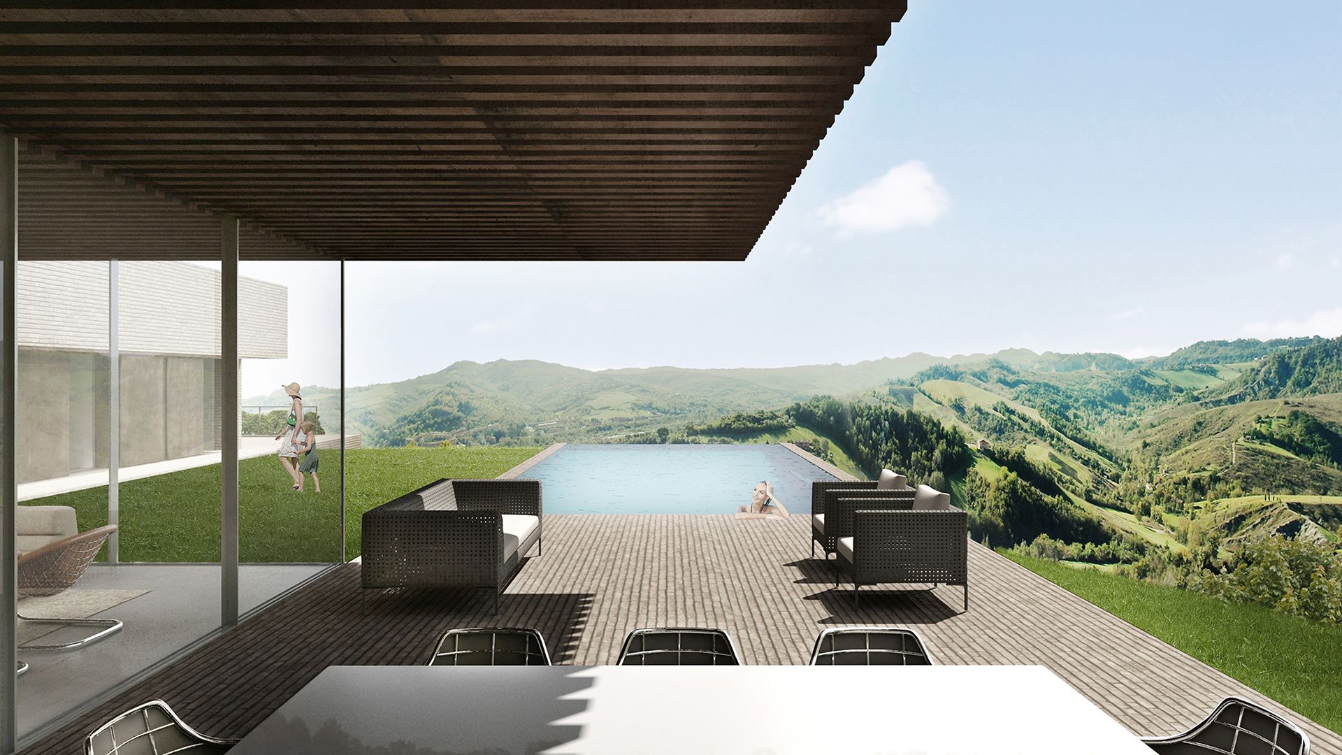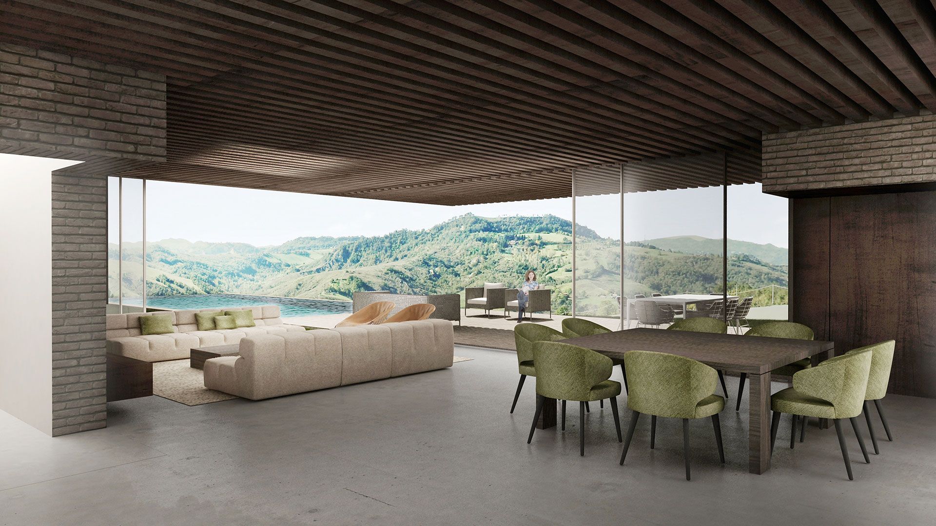 Qui, due pareti completamente vetrate si aprono all'esterno verso sud, instaurando una relazione di simbiosi con il paesaggio collinare e la valle sottostante; lo spazio è una sorta di filtro tra interno ed esterno, e la copertura realizzata con travi di ferro ne accentua l'analogia con un grande pergolato proteso verso il giardino.