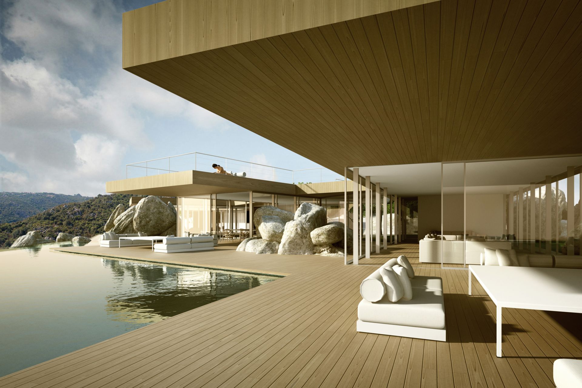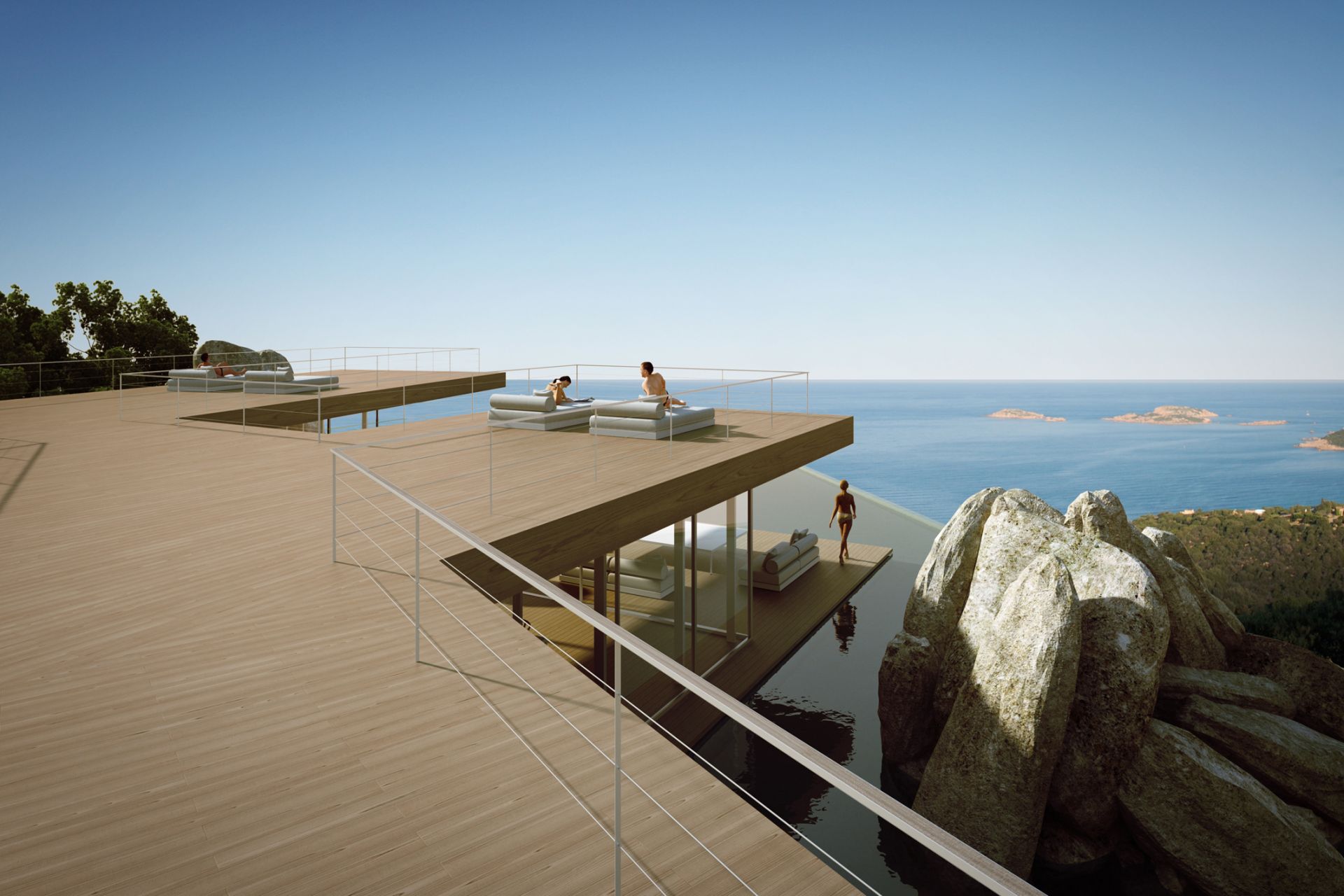 Il programma funzionale, villa padronale e dependance per gli ospiti, viene distribuito sul lotto riducendo l'impatto volumetrico grazie ad un'attenta integrazione con tra rocce e dislivelli naturali del terreno. La villa viene frammentata in quattro corpi distinti, con una disposizione planimetrica simile alle dita di una mano, in modo da favorire le viste sul mare e fornire una naturale protezione delle zone living esterne dal vento prevalente proveniente da Nord-Est. Questi volumi, completamente vetrati, sono appoggiati su una pedana in legno e affacciano su piscina e specchi d'acqua; l'unica copertura aggettante, accessibile da una scala esterna, funziona da solarium e belvedere.
